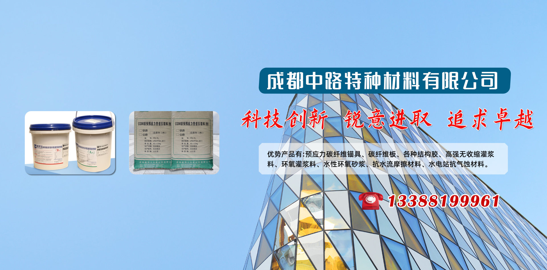 成都中路特種材料有限公司借助清華大學(xué)高分子材料學(xué)科、晨光化工研究院、西南交通大學(xué)、四川交通職業(yè)技術(shù)學(xué)院科研技術(shù)平臺(tái)成為一家集新材料研發(fā)、銷售、技術(shù)服務(wù)和施工于一體的專業(yè)服務(wù)公司,優(yōu)勢(shì)產(chǎn)品有:預(yù)應(yīng)力碳纖維錨具、碳纖維板、各種結(jié)構(gòu)膠、高強(qiáng)無收縮灌漿料、環(huán)氧灌漿料、水性環(huán)氧砂漿、抗水流摩擦材料、水電站抗氣蝕材料和研發(fā)各種特殊用途膠黏劑產(chǎn)品地處西南腹地成都,業(yè)務(wù)覆蓋四川各大中小城市、重慶、云南、昆明、新疆、西藏等區(qū)域。產(chǎn)品涵蓋各種加固施工材料、施工設(shè)備及施工配件,品牌有威士邦等aa進(jìn)口品牌,同時(shí)批發(fā)銷售國產(chǎn)高、中、低端品牌,為客戶提供全面參考。 成都中路特種材料有限公司為您提供加固行業(yè)的一站式服務(wù)! 如果您面對(duì)建筑物加固,不知如何下手,我們將針對(duì)您的項(xiàng)目情況,提供全面的技術(shù)指導(dǎo)咨詢,甚至為您量身定做加固方案;如果您面對(duì)項(xiàng)目要求,不知如何購買加固材料,我們將根據(jù)您的需要,提供多種參考,從進(jìn)口品牌、國內(nèi)知名品牌到低端產(chǎn)品,一應(yīng)俱全; 如果你萬事俱備,不知何處尋找施工人員,我們可以為您提供具有多年加固經(jīng)驗(yàn)的專業(yè)隊(duì)伍;中路特種材料致力于為客戶提供全方位的建筑物加固解決方案。 成都中路特種材料有限公司是一座橋,一座連接廠家與用戶的橋,以質(zhì)量求生存,以信譽(yù)圖發(fā)展,成都中路特種材料有限公司期望用真摯的服務(wù)筑起一座客戶信任之橋。   科技創(chuàng)新 銳意進(jìn)取 追求卓越!        熱忱歡迎業(yè)內(nèi)專業(yè)人士加盟合作!